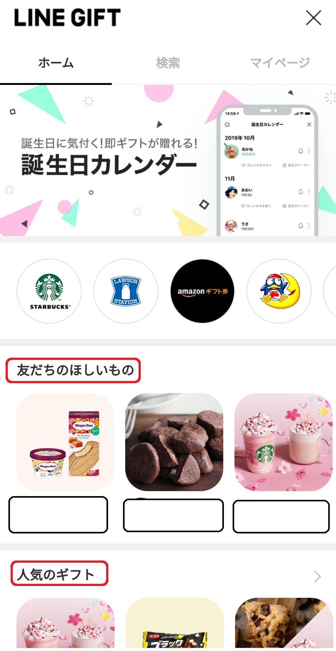 「友だちのほしいもの」欄に贈りたい人の名前があれば、そのほしいものリストからギフトを選択する。名前がなければ「人気のギフト」欄からギフトを選択する。